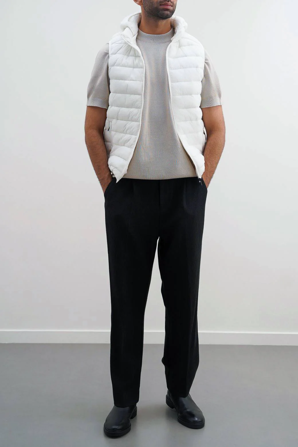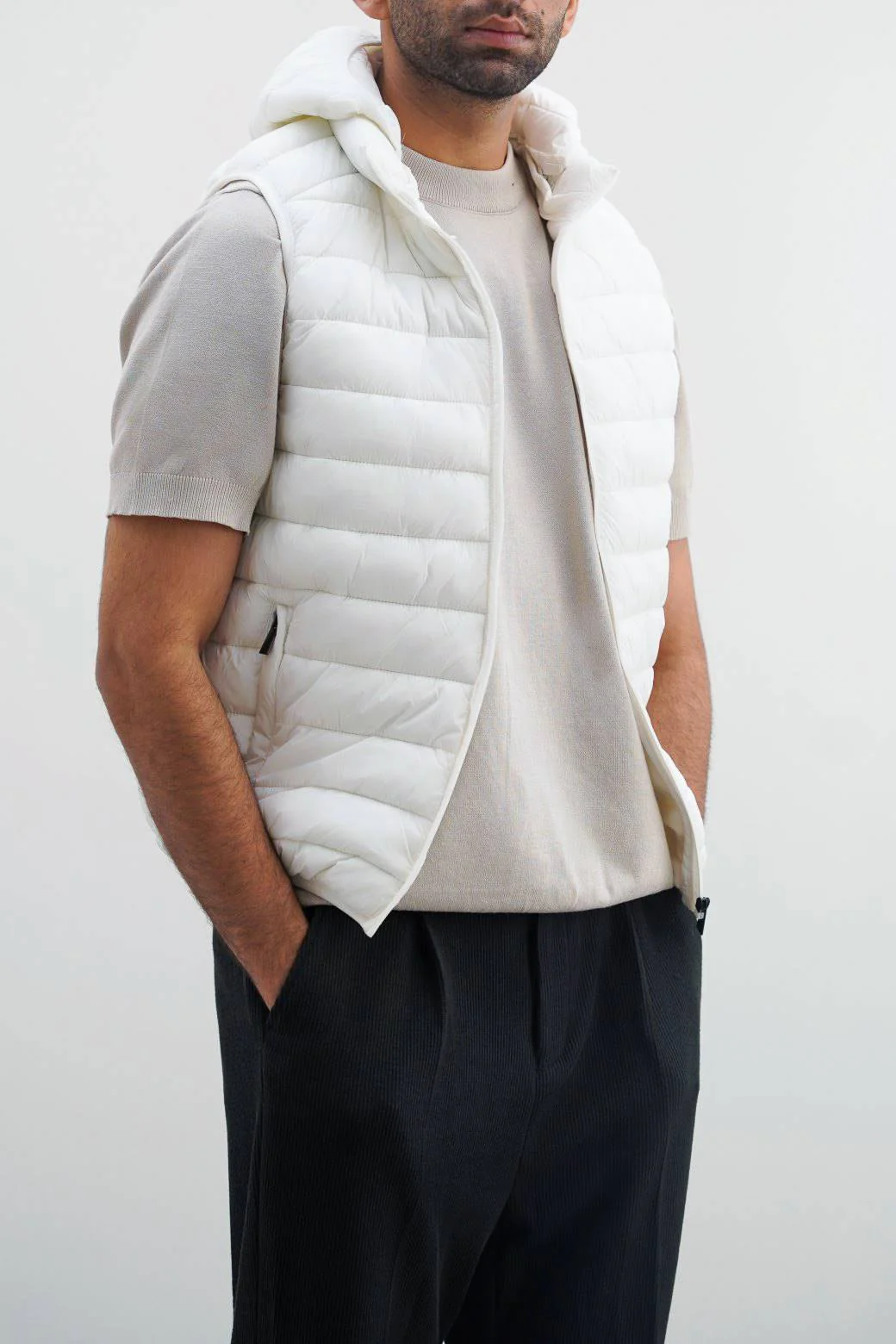Fit type: Regular Design details: Sleeveless Puffer jacket with detachable hood. Cross pockets, front zipper with interior pocket. Stretch: None Transparency: None Hand feel: Soft Lining: Yes, 100% Polyester Fabric: 100% Nylon Size: The model is 185.42 cm/6’1″ and wears large Occasion: Casual